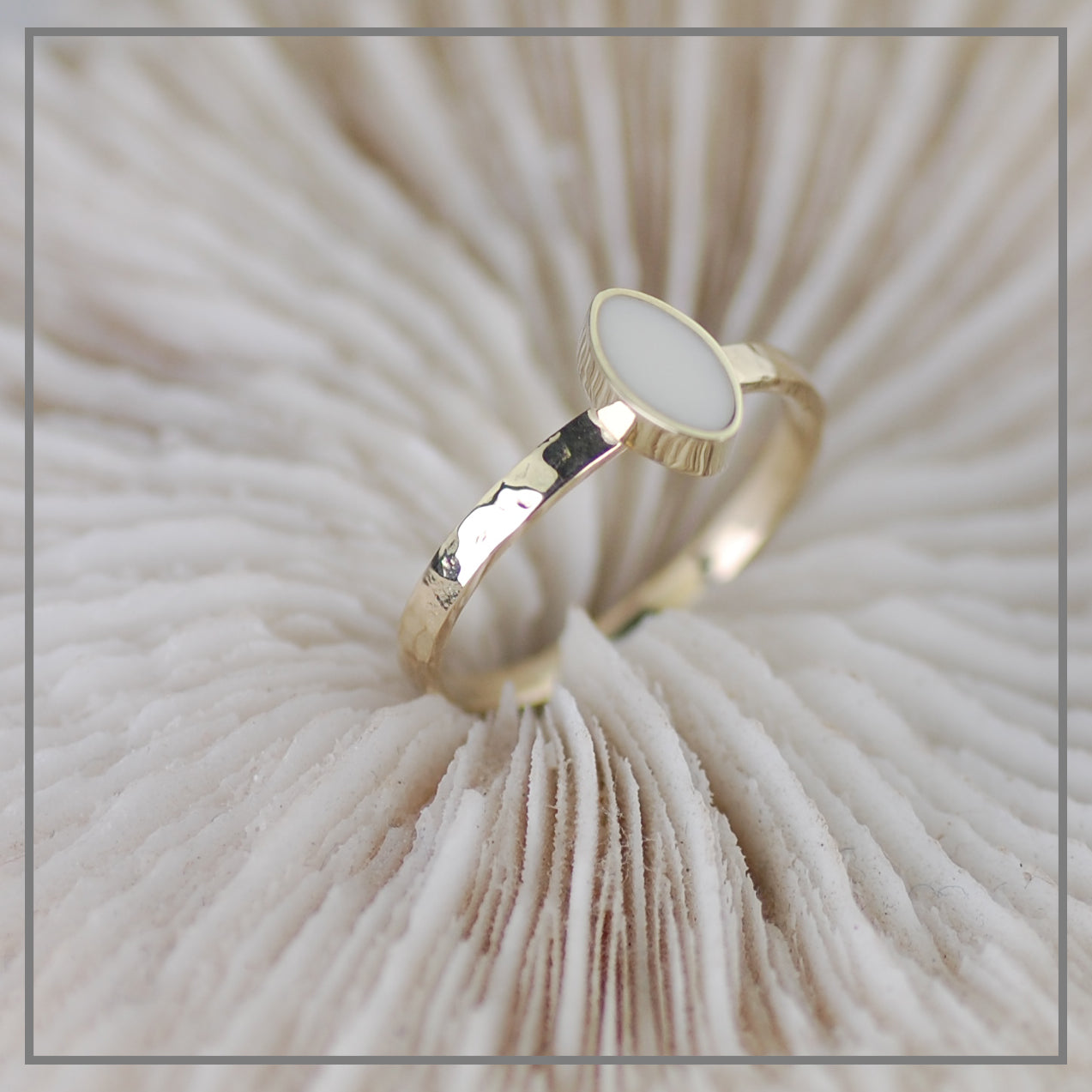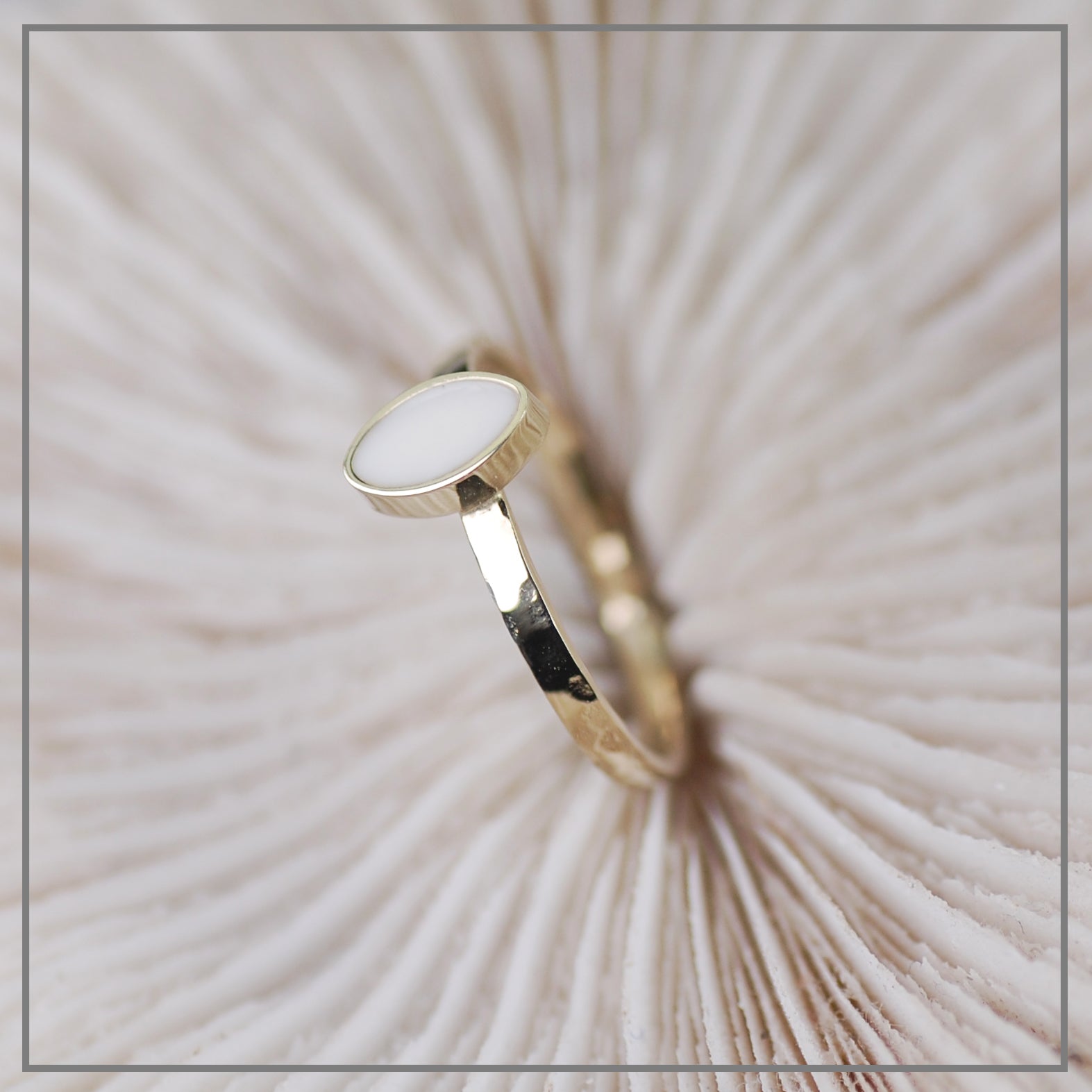 Een subtiel gehamerde ring van goud met een markies van moedermelk.