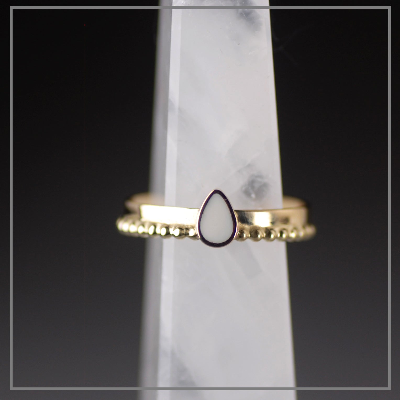 Een robuuste, koninklijke ring van goud met een witte druppel melk.