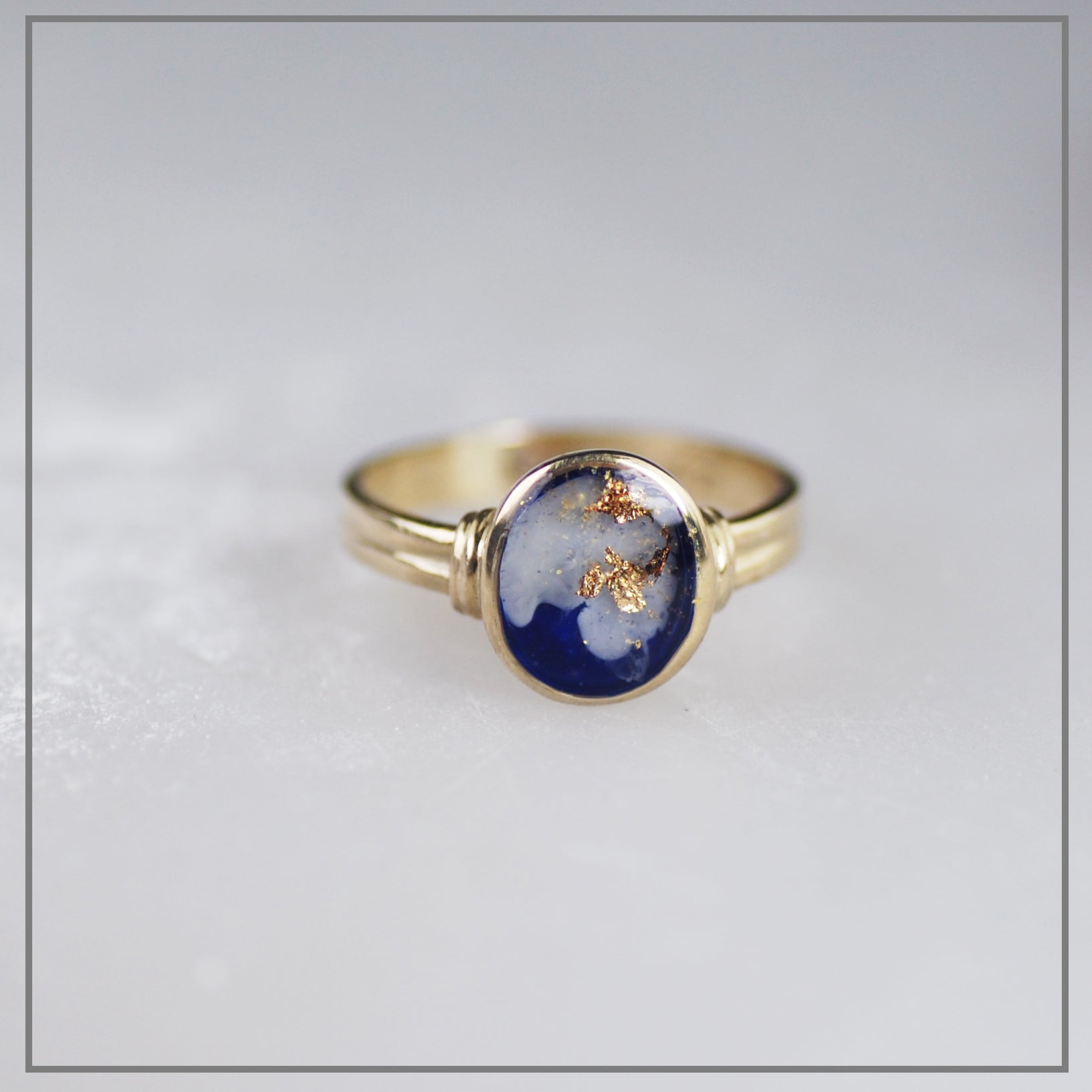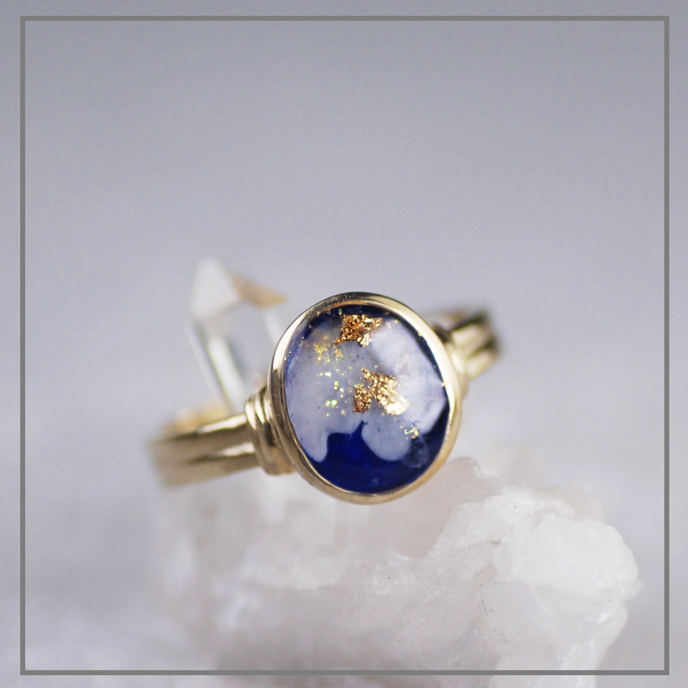 De steen heeft een nachtblauwe kleur met fonkelend bladgoud.
