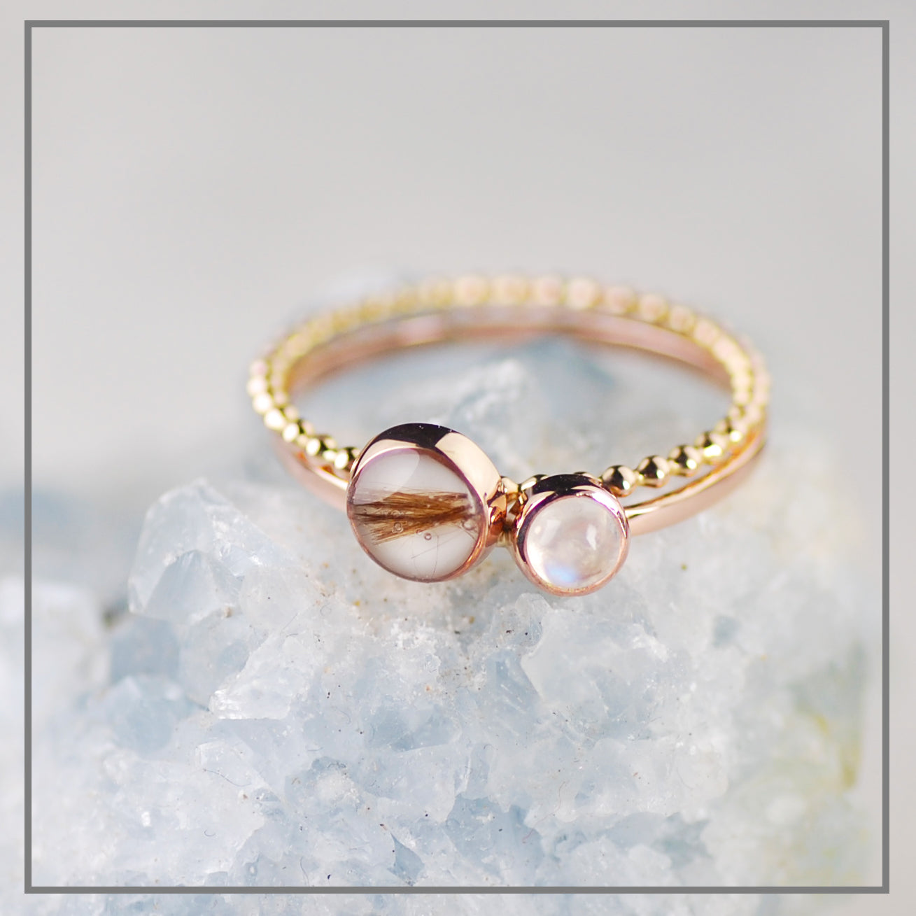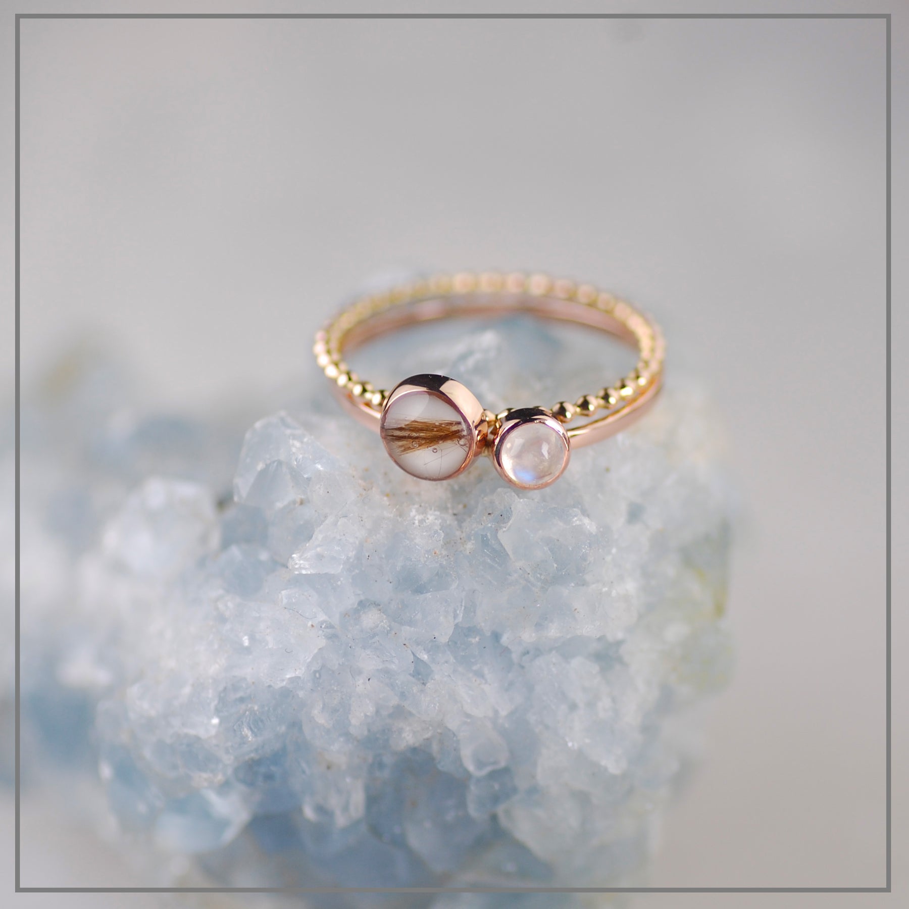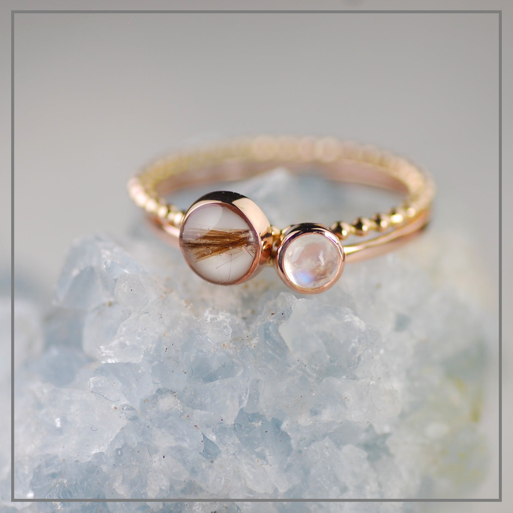 Een roségouden balletjesringetje met moedermelk (en een haarlokje is optioneel). Een bijzondere Rainbow Moonstone zit op de andere ring met haar kenmerkende blauwe lichtspel.